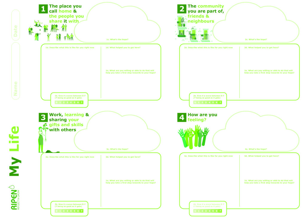 You may notice that the tool is influenced by motivational interviewing. Each one of the sections starts by asking the person to describe their current reality. Once that is described, the person is asked to give that area of life a score. The next task is to consider a hope for this area. The person is then asked what helped them to get to the score they provided. This builds hope and confidence and strengthens importance. It reminds the person of what they’ve already achieved. If the person scores a very low score then they move straight to what might help them take the first step towards the next number.